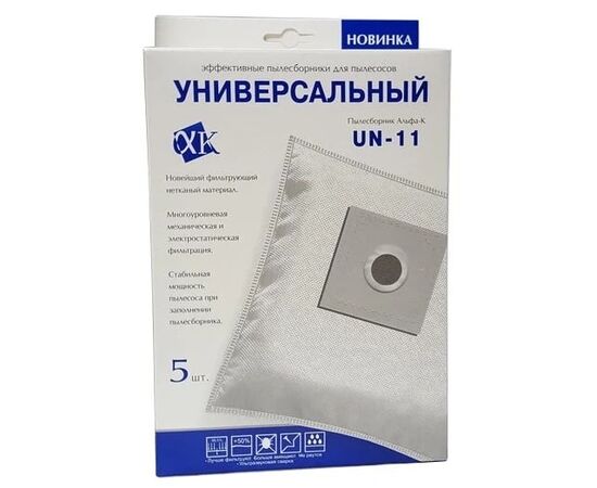 Произведены из экологически чистого, многослойного синтетического фильтрующего материала. Ппылесборники эффективно отфильтровывает мелкие частицы пыли. Первый слой пылесборника отфильтровывает крупный и мелкий мусор. Второй слой пылесборника, благодаря уникальным свойствам материала, фильтрует самые мельчайшие частицы. Третий слой пылесборника, повышенной плотности, задерживает оставшийся мусор. Способны задерживать до 99,5% пыли. Мешки UN-11 предназначены для уборки пыли классов «L».