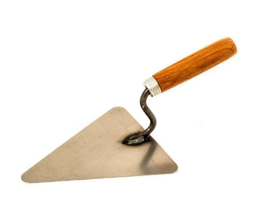 Кельма каменщика треугольная предназначена для перемешивания и нанесения цементного раствора при укладке кирпича.