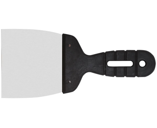 Шпатель-лопатка представляет собой отделочный инструмент, который предназначен для нанесения, выравнивания и сглаживания строительных растворов на больших и малых поверхностях. Полотно выполнено из качественной нержавеющей стали, стойкой к коррозии и механической деформации. Эргономичная рукоять усилена ребрами жесткости и обеспечивает комфортную эксплуатацию. Отверстие в рукоятке служит для удобного хранения инструмента.