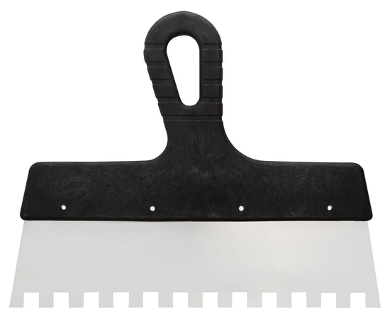 Зубчатый шпатель используется для кладки плитки. Инструмент применяется для разглаживания и расчесывания клея, который помогает крепить плитки к основанию. Полотно из нержавеющей стали отличается высокой прочностью и долговечностью. Эргономичная пластмассовая ручка служит для комфортной работы.