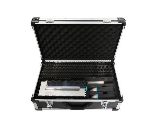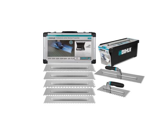 Набор зубчатых шпателей от BIHUI (набор гребенок) из нержавеющей стали поставляется в комплекте с шестью лезвиями размером 280*115*0,7мм., шестью лезвиями размером 480*130*0,7мм., двумя сменными ручками BIHUI FLEX, футляром для переноски 6 лезвий 280*115 и кейсом для хранения всего набора.