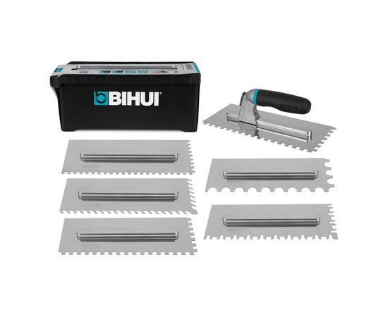 Ручка гребёнок изготовлена из прочного и лёгкого алюминия. Рабочая пластина крепится к эргономичной рукоятке благодаря быстросъёмной системе BIHUI FLEX. Рабочая пластина гребёнок изготавливается из высокоустойчивой к истиранию нержавеющей стали. Гребёнки с открытой рукояткой облегчают контроль за движением инструмента во время нанесения материала. Профессиональные строители ценят инструмент с открытым типом рукоятки за его удобство.
