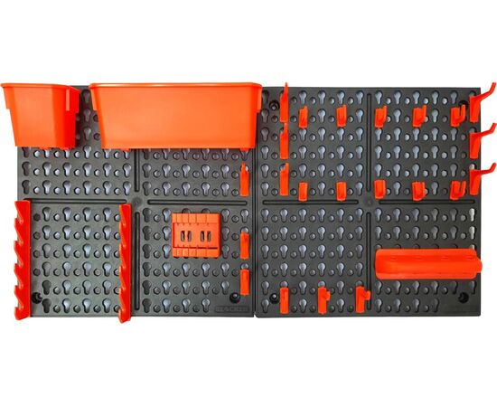 Панель помогает экономить место на рабочем столе, содержать в порядке и быстро находить необходимые инструменты и приспособления. Идеальна для использования дома, на даче, в гараже, мастерской. В комплектацию входят набор из двух типов крючков, держатели для отвёрток, свёрл, ключей и лотки для метизов. Монтаж на вертикальную поверхность осуществляется с помощью саморезов.