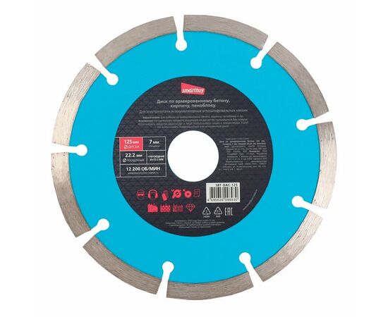 Алмазный диск Smartbuy предназначен для работы с железобетоном и армированным бетоном. Диск также отлично подходит для реза неармированного бетона, кирпича или заливного пола. Диаметр диска 125 мм подходит для большинства болгарок и штроборезов.