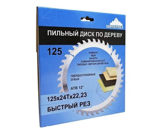 Пильный диск по дереву Vertextools с победитовыми напайками. Диск предназначен для выполнения точных продольных и поперечных чистовых пропилов в мягкой и твердой древесине, прессованной слоистой древесине, фанере, ламинате и ДСП. Напаянные индуктивным способом твердосплавные переменные зубья с агрессивным углом резания обеспечивают одновременно быстрое и точное пиление. Чистота распила зависит от количество зубьев и расстояния между ними. Чем больше зубья, тем чище распил. Основа выполнена из углеродистой стали, напайки на зубах из карбидно-вольфрамового сплава (победита).