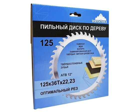 Пильный диск по дереву Vertextools с победитовыми напайками. Диск предназначен для выполнения точных продольных и поперечных чистовых пропилов в мягкой и твердой древесине, прессованной слоистой древесине, фанере, ламинате и ДСП. Напаянные индуктивным способом твердосплавные переменные зубья с агрессивным углом резания обеспечивают одновременно быстрое и точное пиление. Чистота распила зависит от количество зубьев и расстояния между ними. Чем больше зубья, тем чище распил. Основа выполнена из углеродистой стали, напайки на зубах из карбидно-вольфрамового сплава (победита).