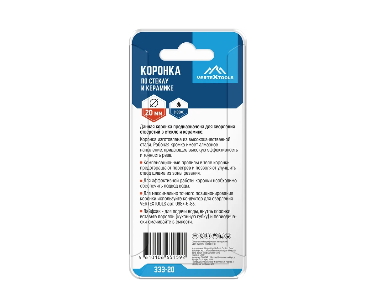 Коронка vertextools 333-20 предназначена для сверления отверстий в стекле и керамической плитке. Рабочая кромка коронки имеет алмазное напыление, обеспечивающее высокую точность реза без трещин и сколов. Вертикальные пропилы в корпусе предотвращают деформацию коронки при нагреве во время работы.
