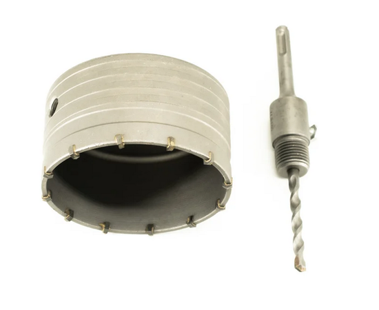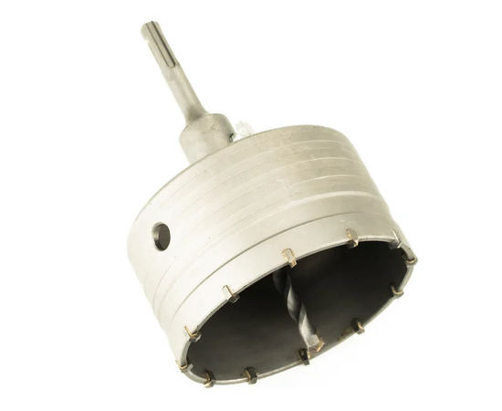 Коронка твердосплавная ударная в сборе с держателем SDS+ 110 мм применяется для выполнения промышленных работ по сверлению при помощи перфоратора с патроном SDS-plus бетона, кирпича, природного и искусственного камня, а также плотных известняков. Режущую часть образуют твердосплавные зубцы, которые напаиваются на кромку коронки.