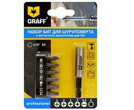 Набор бит для шуруповерта из 7 предметов GRAFF , включая адаптер (магнитный держатель). Набор профессиональных холоднокованных бит для шуруповерта в удобном пластиковом футляре. В набор входят 6 бит: PH 1x25 мм - 1 шт., PH 2x25 мм - 1 шт., PZ 1x25 мм - 1 шт., PZ 2x25 мм - 1 шт., SL 4,5x25 мм - 1 шт.,SW 4x25 мм - 1 шт. Кроме того, в набор включен адаптер для бит - магнитный держатель. Очень качественный держатель для бит GRAFF оснащен мощным магнитом, что позволяет удерживать даже самые большие шурупы и саморезы.