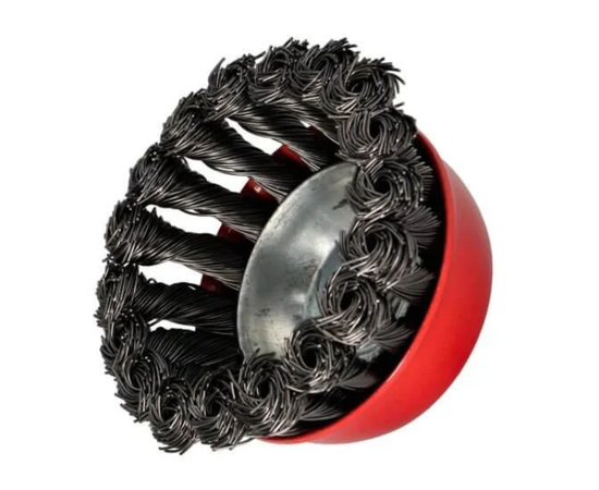 Передняя щетка с оплеткой из стальной проволоки резьба M14. Для легкой и средней степени очистки. Для удаления ржавчины, абразивных работ, зачистки заусенцев, снятия краски