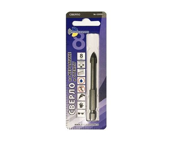 Сверло по кафелю и стеклу твердосплавное копьевидное 8х44 мм TRIO-DIAMOND (430008) предназначено для работы шуруповертом, дрелью в безударном режиме. Мокрый тип сверления. Назначение: керамика, стекло. Производство Китай.