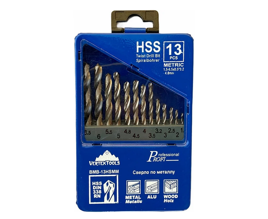 Набор сверл по металлу HSS 13 шт, 1.5-6.5 мм Vertextools предназначен для сверления металлических конструкций и заготовок.