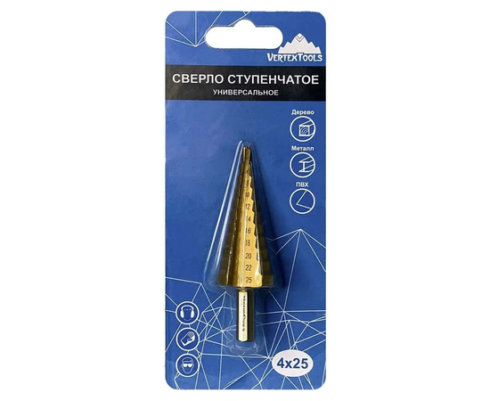 Сверло ступенчатое 4-25 мм, 11 ступеней vertextools 4-25 предназначено для получения отверстий различного диаметра без перестановки режущего инструмента в изделиях из цветных металлов, пластика и стальных листах.