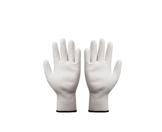 Перчатки на бесшовной «дышащей» основе из полиэстера обеспечивают великолепную тактильную чувствительность. Полиуретановое покрытие обеспечивает отличный захват на поверхностях любого вида. Эти перчатки предназначены для легких и тонких операций в сухих средах, для выполнения которых требуется максимальная чувствительность рук. Анатомическая форма нейлоновой перчатки обеспечивает возможность точного манипулирования мелкими предметами. Перчатки не оставляют отпечатков пальцев и ворсинок, что немаловажно для многих производств. Двойной оверлок с латексным кольцом обеспечивает превосходную фиксацию перчатки на запястье.