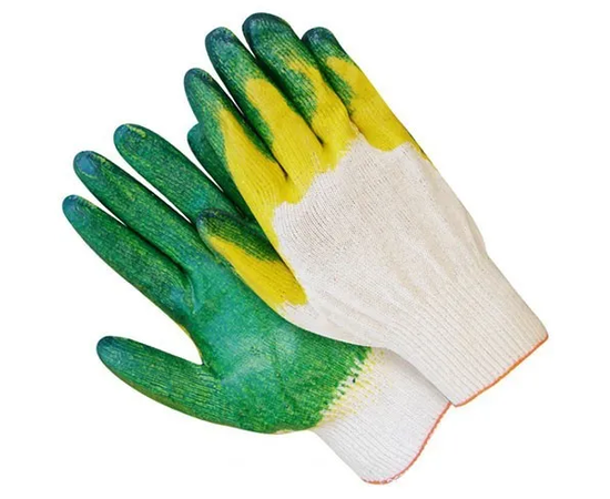 Перчатки кругловязанные, изготовлены из ХБ трикотажа с двойным частичным обливом из натурального латекса. Класс вязки 13. Модель отличается высокой степенью прочности и надежности, поскольку латексный наладонник имеет два слоя. Наличие рельефного латексного покрытия позволяет избежать проскальзывания. Тыльная сторона из ХБ нитей обеспечивает вентиляцию, поддерживая комфортную температуру. Возможна неоднократная машинная стирка при 40С. Перчатки рабочие х/б также рекомендованы к использованию при выполнении многих видов механических работ.