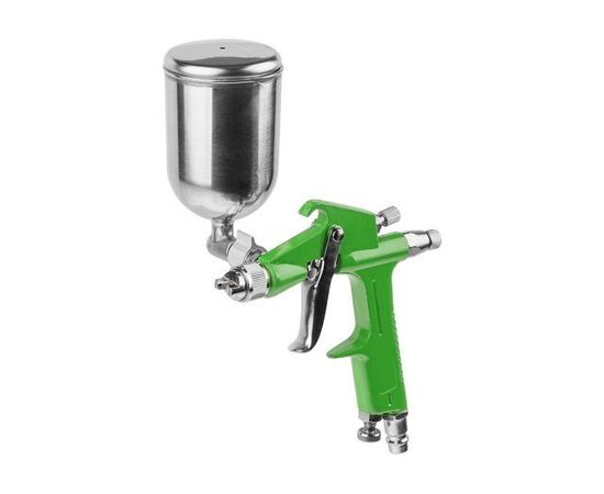 Компактный краскораспылитель типа HVLP с поворотным металлическим бачком разработан для работ в труднодоступных местах. За счет изменения положения бачка материал можно наносить на поверхности в разных плоскостях.