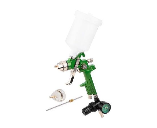 Краскораспылитель HVLP 2-в-1 для нанесения грунта и эмали. В комплекте идет 2 сопла - 1.4 и 1.7 мм. Регулятор с манометром в комплекте позволяет настроить работу краскораспылителя максимально точно.