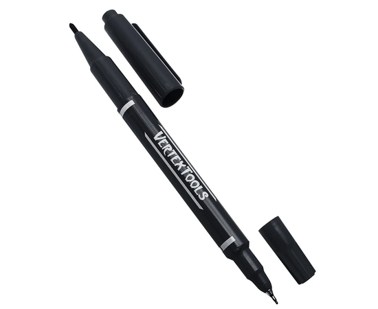 Перманентный двухсторонний маркер VERTEXTOOLS чёрный подходит для нанесения стандартной разметки и маркировки малых размеров. Краска устойчива к влаге и не стирается без растворителя. В состав не входит ксилол, что делает маркер безопасным.