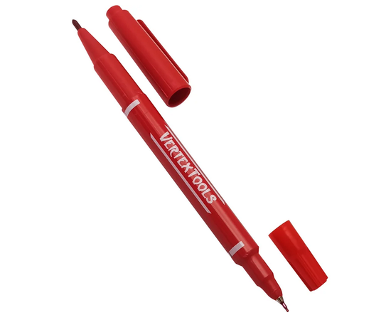 Перманентный двухсторонний маркер VERTEXTOOLS красный подходит для нанесения стандартной разметки и маркировки малых размеров. Краска устойчива к влаге и не стирается без растворителя. В состав не входит ксилол, что делает маркер безопасным.