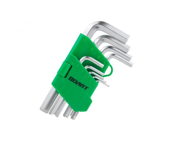 Набор ключей шестигранных 1,5-10 мм 9 предметов коротких ВОЛАТ (11015-09) состоит из 10 инструментов Г-образной формы с разнодлинными сторонами, предназначенных для откручивания и закручивания болтов с внутренним шестигранником размером 1.5, 2, 2.5, 3, 4, 5, 6, 8 и 10 мм. Ключи собраны в удобный футляр для хранения, благодаря чему не потеряются и будут под рукой в нужный момент.