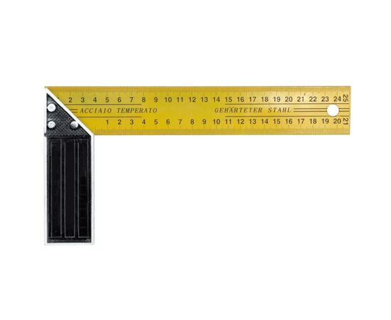 Угольник столяра 300 мм используется для определения правильного угла при столярных работах, имеет четкую градацию и конструкцию из легкого материала. В точке соединения - угол 45 градусов.