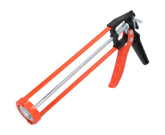 Пистолет для силикона скелетный - предназначен для выдавливания герметика из тубы и его нанесения в целях изоляции,фиксации и заполнения пустот. Усиленный металлический корпус, устойчив к растяжениям и механическим нагрузкам при нанесении герметика. Конструкция пистолета представляет собой стальную рамку скелетного типа, курковый механизм со штоком и рукоятку. Корпус является емкостью для баллона с герметиком, курок приводит шток с поршнем в движение, в результате чего герметик поступает из баллона на обрабатываемую поверхность.