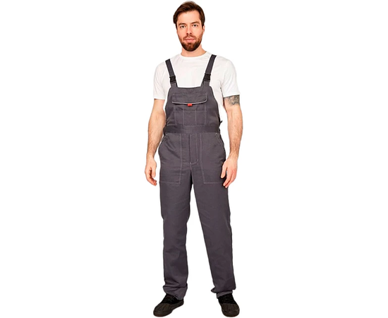 Полукомбинезон прямого силуэта с застёжкой в левом боковом шве на три петли и пуговицу, гульфик на молнии. Бретели на резинках регулируются фастексами. На нагруднике расположен двойной накладной карман с клапаном на контактной ленте, малый накладной карман разделён на три части. Боковые накладные карманы имеют наклонную линию входа. На задней половине расположен фигурный накладной карман. Есть двойной карман для инструментов.