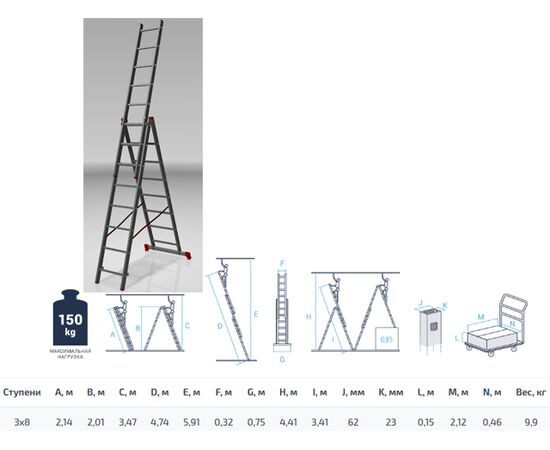 Высота лестницы - 474см, высота стремянки - 201см, высота секции - 214см.