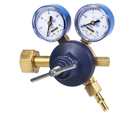 Кислородный редуктор c радиальным подключением. Корпус изготовлен из алюминия, крышка из специального пластика. Поставляется в комплекте с универсальным ниппелем.