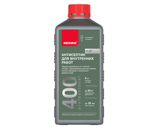 NEOMID 400 ECO — новое высокоэффективное деревозащитное средство на водной основе для внутренних работ. Предназначено для усиленной защиты древесины на срок до 25 лет от гниения, поражения дереворазрушающими и деревоокрашивающими плесневыми грибам.