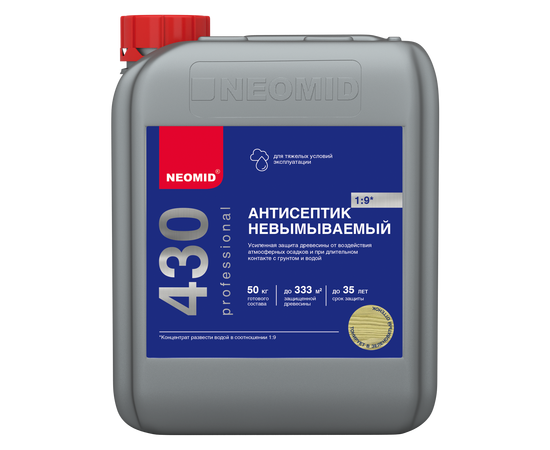 NEOMID 430 ECO – консервирующий невымываемый антисептик для наружных и внутренних работ. Обеспечивает максимальную защиту древесины различных пород в тяжелых условиях эксплуатации, в том числе при длительном контакте с грунтом и влагой.