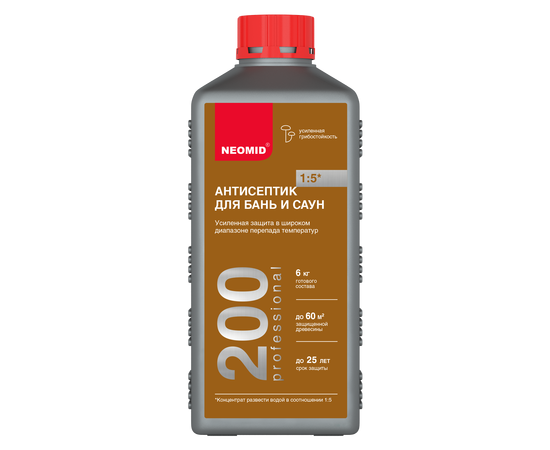 Антисептик НЕОМИД 200 для бань и саун 1 л новое высокоэффективное средство для усиленной защиты древесины внутри бань и саун, включая полки и скамейки. Обеспечивает сверхвысокую защиту древесины от гниения, дереворазрушающих и деревоокрашивающих плесневых грибов, в условиях частого перепада температур и повышенной влажности на срок до 25 лет. Не изменяет структуру древесины, не препятствует дальнейшей обработке, склеиванию и окраске. Экологически безопасен, не токсичен.