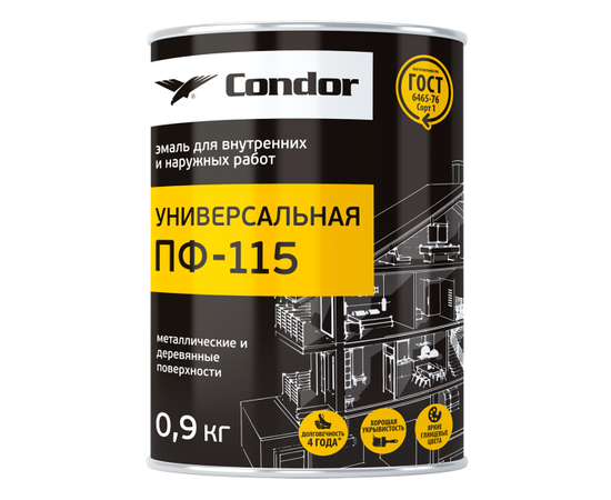 Для окраски металлических и деревянных поверхностей. Образует глянцевое атмосферостойкое покрытие. Защищающее поверхность от воздействия климатических факторов и перепадов температур. Двухслойное покрытие эмали, нанесенное на подготовленную поверхность, в умеренном и холодном климате сохраняет свои защитные свойства в течение 4 лет (при условии соблюдения технологии нанесения). Эмаль алкидная ПФ-115 предназначена для защитно-декоративной окраски металлических (металлоконструкции, ворота, изгороди, оборудование и др), деревянных (дверей, оконных переплетов, садово-парковой мебели и пр.) и других поверхностей, подвергающихся атмосферным воздействиям и для окраски поверхностей внутри помещений (кроме полов).Не применять для окрашивания оцинкованных поверхностей, цветных металлов и нержавеющей стали. Расход 100-180 г/м² при однослойном нанесении. На расход влияет тип поверхности и ее подготовка, а также цвет эмали. Время высыхания каждого слоя эмали при температуре (20 ± 2) °С — 24 ч.