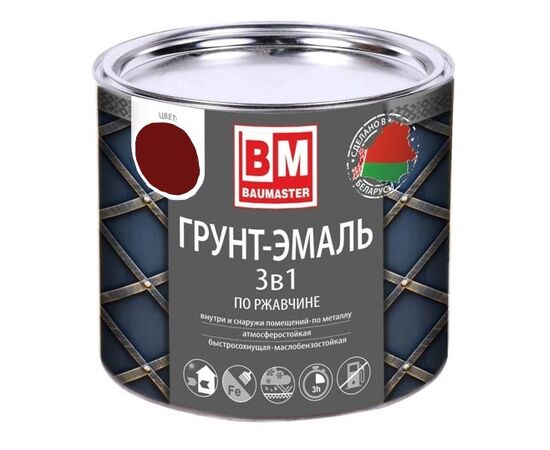 Грунт-эмаль по ржавчине 3 В 1 «BAUMASTER» совмещает в себе антикоррозионный грунт, маслобензостойкую эмаль и преобразователь ржавчины. Возможно окрашивание, как чистого металла, так и содержащего продукты коррозии толщиной до 80 мкм. Грунт-эмаль предназначается для маслобензостойкой и антикоррозионной окраски различных узлов и агрегатов из стали и чугуна в машиностроении. Применяется внутри и снаружи помещений по металлу.