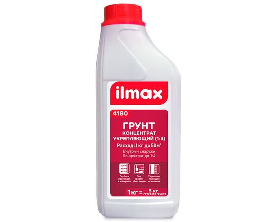 Ilmax 4180 применяется для грунтования минеральных оснований: бетона, цементных и гипсовых штукатурок, кирпича, стяжек перед нанесением клеевых растворов, краски, шпатлевки. Используется внутри и снаружи помещений. После высыхания образует прозрачное покрытие, которое предотвращает появление грибка и плесени. Грунтовка концентрированная и для работы ее необходимо разбавлять водой 1:2 или 1:4. Расход концентрата 20-50 г/м2. Время сушки составляет 2-3 часа. Объем банки — 1 литр.