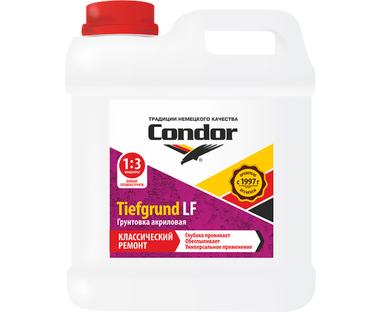 Концентрированная акриловая грунтовка Condor Tiefgrund LF используется для обработки бетонных, кирпичных, деревянных и других пористых оснований перед отделкой. Создаёт на поверхности пленку, уменьшающую впитывающую способность оснований и улучшающую сцепление с отделочным слоем. В зависимости от типа обрабатываемой поверхности расход колеблется от 10-33,3 м2/л при однослойном нанесении.