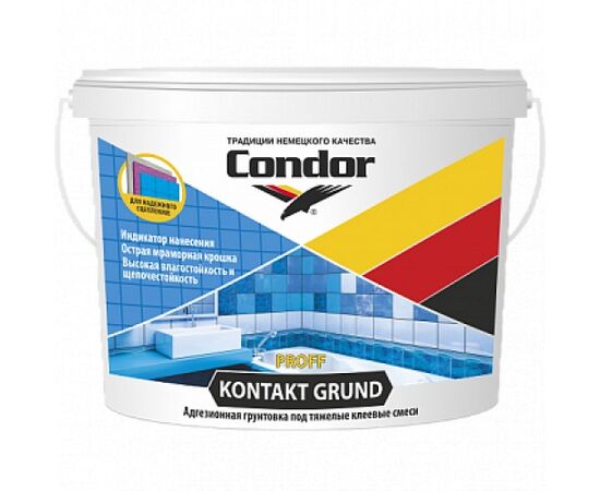 Грунтовка Condor Kontakt Grund предназначена для обработки плотных строительных материалов (монолитные бетонные стены, железобетонные конструкции и др.) с целью создания промежуточного слоя перед нанесением тяжелых клеевых смесей, гипсовых, полимерцементных и других штукатурок, а также структурных красок и шпатлевок.