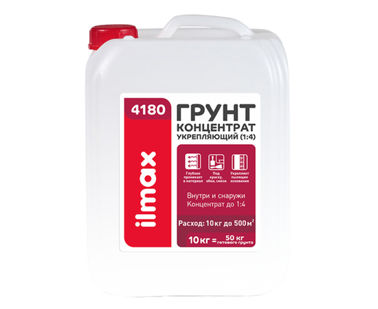 Грунтовка ILMAX 4180 Укрепляющий концентрат 5 л предназначен для грунтования минеральных оснований: бетон; цементные, цементно-известковые, гипсовые штукатурки; кирпич и блоки из ячеистого бетона; гипсокартонные и гипсоволокнистые листы; цементные и гипсовые стяжки. Перед укладкой последующих покрытий: клеевых и ремонтных растворов; штукатурок, шпатлевок, красок; стяжек, самонивелирующихся растворов. Грунт ILMAX 4180 является концентратом. Перед приготовлением раствора грунт тщательно перемешивается и смешивается с водой в соотношении от 1:2 до 1:4 в зависимости от впитывающей способности основания. Для приготовления использовать чистую воду (t=+10…+25°C).