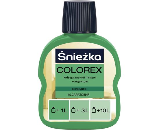 Колорекс - водная дисперсия пигментов с добавлением вспомогательных средств, которые также позволяют сочетать его с изделиями на основе растворителей. Концентрат предназначен для расцветки избранным цветом готовых водорастворимых красок и красок на основе растворителей: эмульсионных, масляно-фталевых, клеевых, нитроцелюлозных, хлоркаучуковых. Некоторые из имеющихся цветов можно применять вне помещений. Пигментный концентрат предназначен для расцветки эмульсионных, клеевых, масличных, фталевых, хлоркаучуковых и других красок. Добавлять в зависимости от желательного цвета, не более чем 10% объема.
