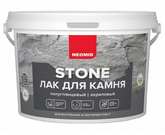 «NEOMID Stone» – лак на акриловой основе с эффектом «мокрого камня» для наружных и внутренних работ, практически не имеет запаха. Образует прочное прозрачное покрытие, увеличивает атмосферо- и влагостойкость обрабатываемых материалов, предназначен для защитно-декоративного покрытия кирпича, искусственного и натурального декоративного камня, бетона, черепицы, известняка внутри и снаружи помещений. Предотвращает появление плесени, высолов, защищает от воздействия атмосферных осадков. Сохраняет декоративные и защитные свойства в течение длительного времени. Не содержит растворителей.