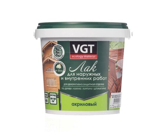 Лак акриловый VGT для наружных и внутренних работ Матовый бесцветный 2,2 кг используется для декоративной отделки и защиты деревянных (кроме полов), кирпичных, бетонных и других минеральных поверхностей, а также природного и искусственного камня, бумажных обоев и стеклообоев. Применяется для наружных и внутренних работ во всех типах зданий и сооружений (А-В).