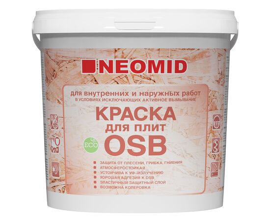 Краска для плит OSB Neomid применяется для окрашивания предварительно загрунтованных OSB-плит, а также поверхностей из дерева, фибролитовых плит, ДВН, ДСП и других пористых материалов внутри и снаружи зданий и сооружений.