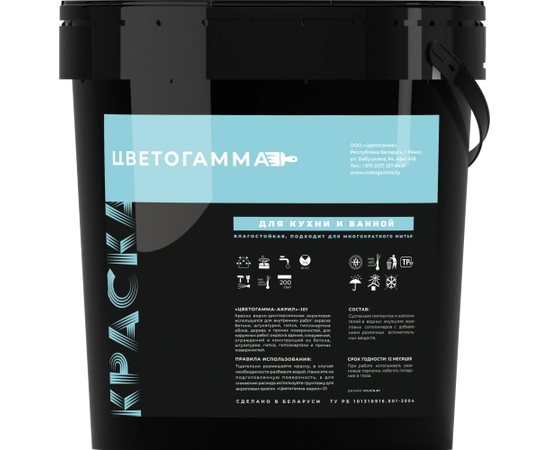 • Влагостойкость: Устойчивость к влаге и конденсату делает краску идеальной для использования в помещениях с повышенной влажностью.