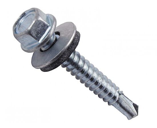 Шуруп-саморез кровельный размером 5,5х32 мм предназначен для крепления металлочерепицы и металлопрофиля к основанию. Изготовлен из стали с оцинкованным покрытием. Представляет собой изделие с крупной резьбой и уже надетой прорезиненной прокладкой. Головка — шестигранная. Сверло на конце позволяет закручивать шуруп в металл без предварительного засверливания.