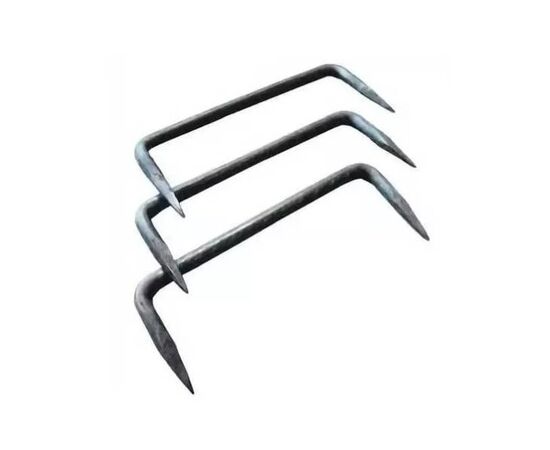 Скоба представляет собой металлическое изделие, по форме напоминающее букву «П». Скоба состоит из "ножек" и "спинки". Концы "ножек" выполнены в виде острых четырехугольных конусов. Скобы изготавливают из гладкого круглого стального прутка методом горячей ковки.