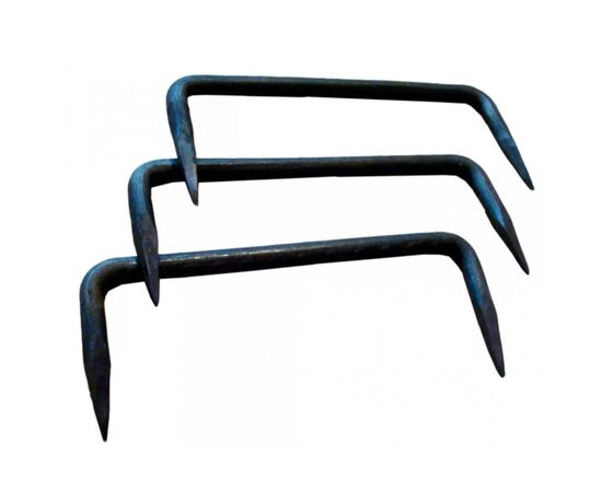 Скоба представляет собой металлическое изделие, по форме напоминающее букву «П». Скоба состоит из "ножек" и "спинки". Концы "ножек" выполнены в виде острых четырехугольных конусов. Скобы изготавливают из гладкого круглого стального прутка методом горячей ковки.