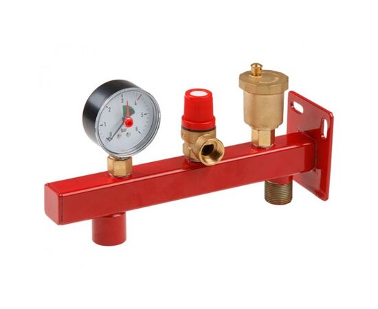 Группа безопасности расширительного бака представляет собой смонтированные на полой консоли предохранительный клапан (настройка фиксированная, 3 бара), автоматический воздухоотводчик, манометр.
