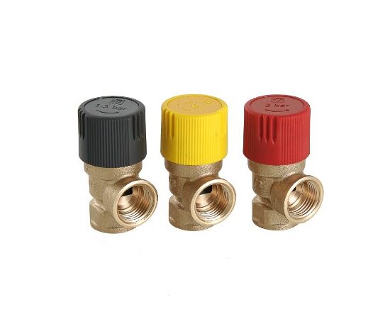 (VT.0490.IG) Клапан предохранительный нерегулируемый, c фиксированной заводской настройкой 1,5/3,0/6 бар (для удобства пользования введена цветовая маркировка: черный колпачок – 1,5 бара, красный – 3, желтый – 6 бар). Обеспечивает защиту от превышения давления водогрейных котлов, бойлеров, сосудов под давлением, систем отопления, напорных трубопроводов сбросом рабочей среды (вода, гликолевые незамерзающие теплоносители, воздух, природный, сжиженный газ и т.д.) в окружающую среду либо дренажный трубопровод. Область применения – системы тепловой мощностью не более 43,7 кВт. Максимальная рабочая температура – 120 °С. Предусмотрена возможность ручного открытия клапана предохранительного для проверки работоспособности, профилактики залипания золотниковой обоймы. Резьба присоединения – внутренняя, 1/2".