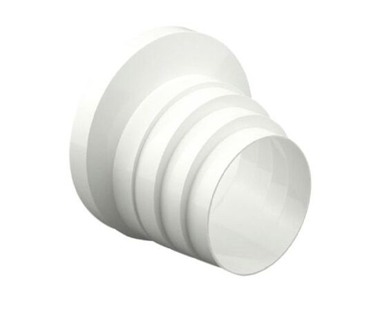Переходник воздуховода предназначен для соединения круглых каналов разных диаметров. Изготавливается из пластика белого цвета.