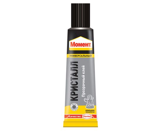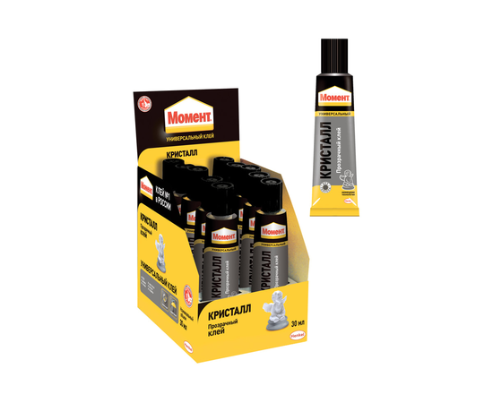 Универсальный клей Момент кристалл идеален для склеивания мягкого и жесткого ПВХ, в различных сочетаниях склеивает дерево, металл, кожу, картон, ткань, керамику, стекло. Не подходит для посуды, контактирующей с пищей. Начальной прочности склеивания достаточно для того, чтобы сразу подвергать поверхности дальнейшей обработке. Для того, чтобы клей хорошо взялся, необходимо сильное кратковременное давление на склеиваемые поверхности. Максимальная прочность достигается через 3 дня в зависимости от материала и силы нажатия при склеивании. Клей объемом 30 граммов упакован в шоу-бокс.